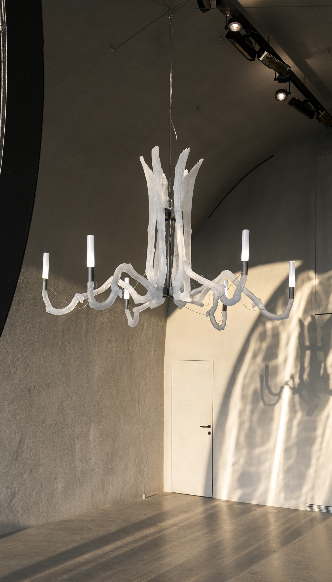 The chandelier is inspired by the hero Atrey from the iconic movie The NeverEnding Story - the world of childhood imagination, dream symbolism and natural structures. Six crystal glass branches with the imprint of real tree bark create the impression of floating motion in space – as if time and substance were frozen in a single moment. In the context of (A)void Gallery's raw aesthetic, Atrey presents an elegant counterpoint - clear and precise, yet vivid and organic. Atrey's design is based on the Mono no aware chandelier created for the Czech National Pavilion at EXPO 2025 in Osaka, part of Rony Plesl's monumental glass installation.