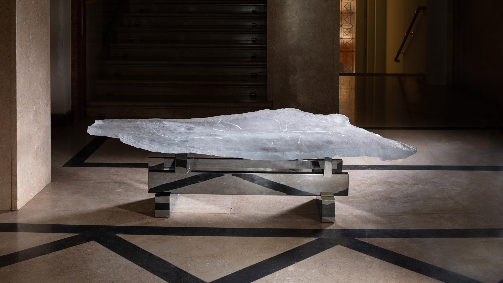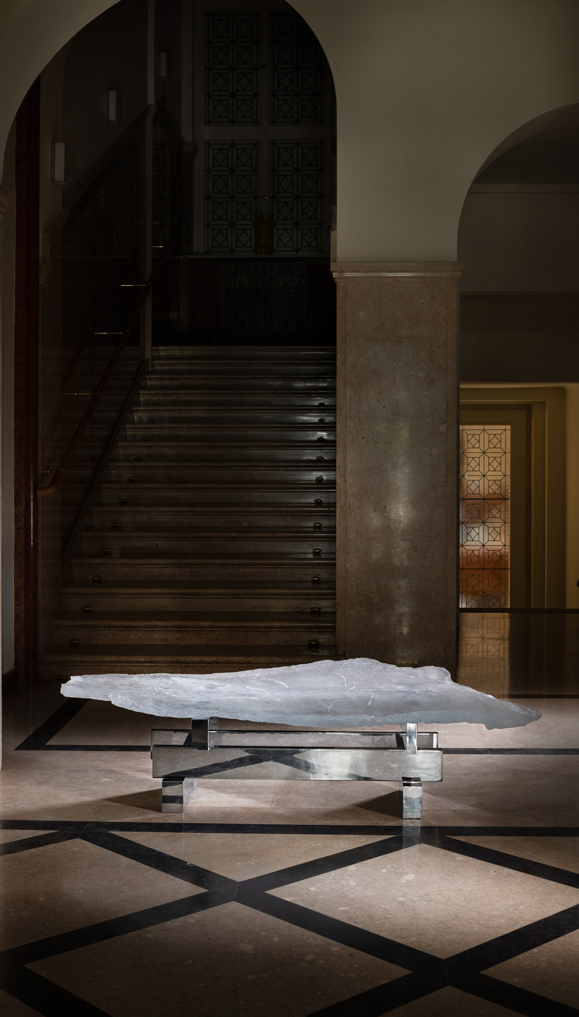 The original table oscillates between art and design. The structure resembles a lunar landscape, yet it is a realistic glass cast of a large slate fragment. The tabletop has a relief on both sides due to the unique Vitrum Vivum technology